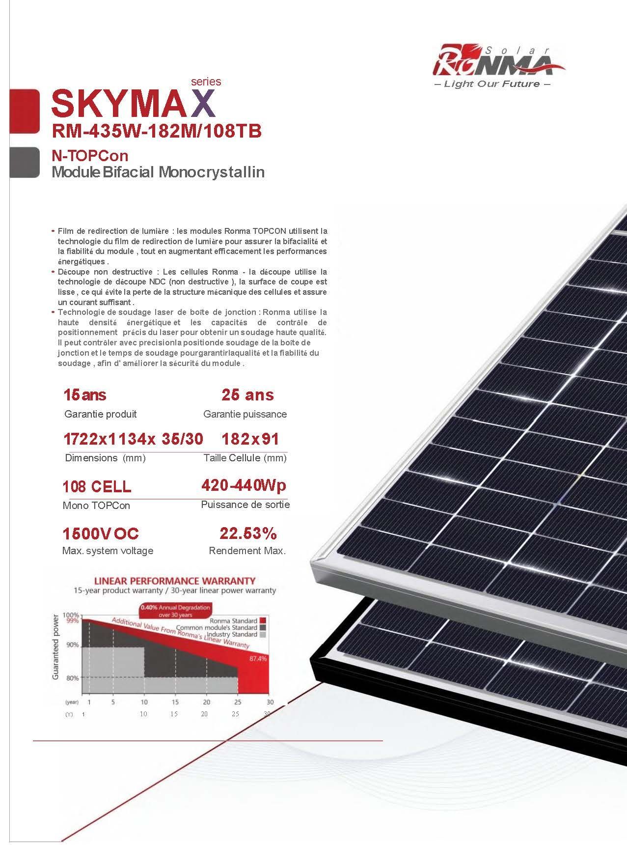 Ce panneau solaire utilise la technologie N-TYPE, qui offre une efficacité et une durabilité supérieures à celles des panneaux solaires traditionnels. Il est également garanti 25 ans, ce qui vous assure une tranquillité d'esprit pendant de nombreuses années.