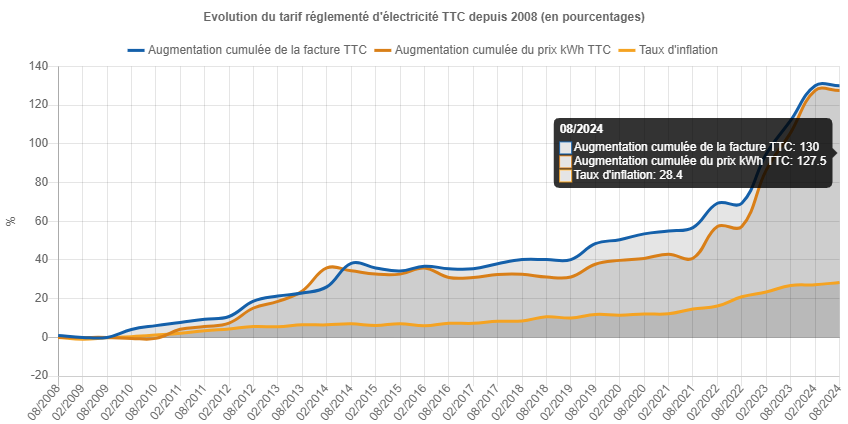 Après 4% de hausse en février 2022, 15% en février 2023 et 10% en août 2023, une quatrième augmentation du prix de l'électricité en deux ans a été appliquée en février 2024 (de 8,6 à 9,8% selon l'option tarifaire). L'augmentation totale sur deux ans est de l'ordre de 43 à 44%. Pour le début de l'année 2025, le tarif réglementé de l'électricité va cependant baisser de 14% mais reste à un niveau élevé et le TURPE (tarif d'utilisation des réseaux publics d'électricité) qui représente environ un tiers de la facture finale des ménages a augmenté de 10% en février 2025 ! La tendance à long terme reste donc à la hausse du fait que ENEDIS et RTE doivent à l'avenir investir massivement pour moderniser et assurer un bon fonctionnement du réseau d'électricité